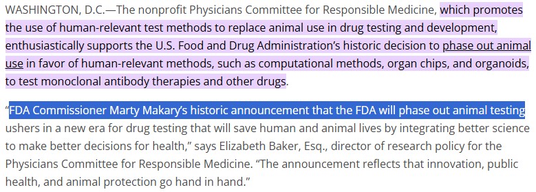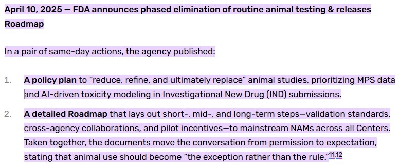‘25.4월 FDA 커미셔너는 단일클론 항체 등 일부 분야에서 동물시험을 단계적으로 폐지하고 컴퓨터 모델, 장기-칩, 오가노이드 등 인체 기반 기법으로 전환하겠고 발표하였다.