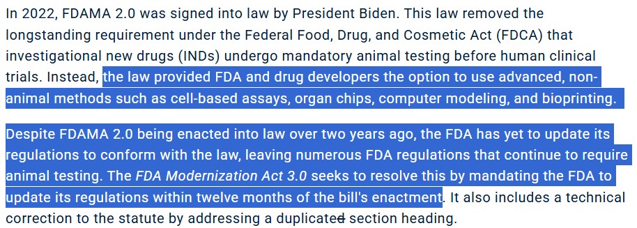 ’22년 통과된 FDAMA 2.0은 신약 임상전 동물실험 의무 조항을 삭제하고 세포 기반 분석, 장기 칩(Organ-on-Chip), 컴퓨터 모델링, 바이오프린팅 등 비동물 대체시험법(NAMs)을 명시적으로 허용하였으나, FDA의 후속 규정 정비가 지연되었다.