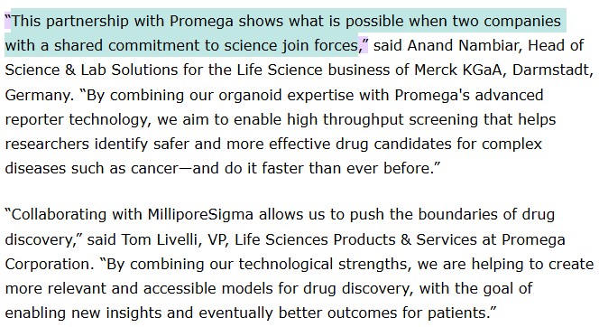 ‘25.10월 머크의 자회사 밀리포어시그마는 美 Promega社와 3D 세포Drug Screening 기술 공동개발 파트너십을 체결하여, 고도화된 오가노이드 실시간 분석 기법을 함께 개발하고 있다.