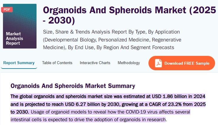 Grand View Research에 따르면 ’24년 $1.86B인 세계 오가노이드 및 스페로이드 시장이 ’30년 $6.27B까지 성장할 것으로 추정되며, CAGR은 무려 23.2%에 달한다.