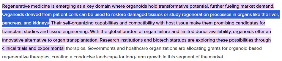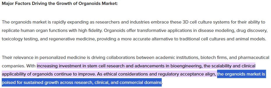 오가노이드 기술이 연구용에서 임상 응용 단계로 확대되면서 수요가 폭증할 것임을 시사한다.
