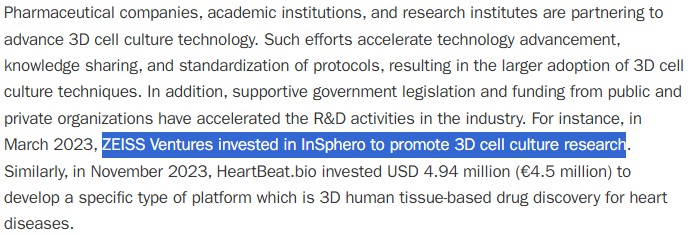 Zeiss는 ’23년 스위스 InSphero에 투자했다.