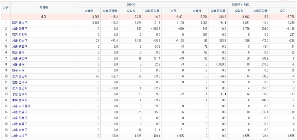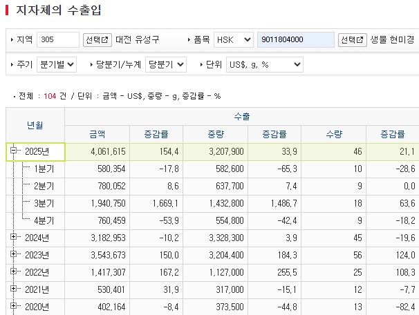 대전 유성구 기준 분기별 수출통계는 다음과 같다.