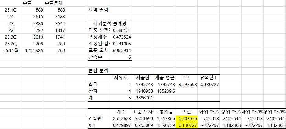 또한, 대전 유성구 수출통계와 실제 매출로 인식된 수출을 회귀분석해보면 수출통계의 P-value가 0.13으로 나와 유의성이 다소 떨어지는 것을 확인할 수 있다.