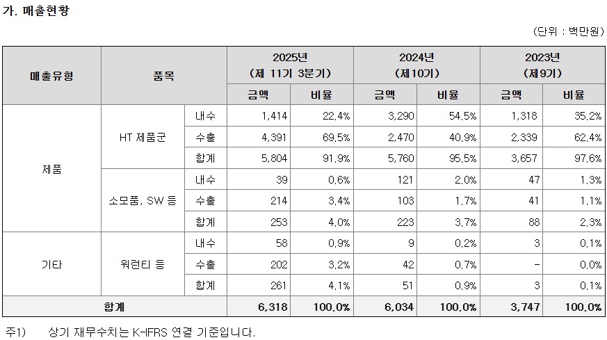 수출비중이 25.3Q 누적 기준 76.1%이다(HT 제품 69.5%+소모품/SW 3.4%+기타 3.2%)