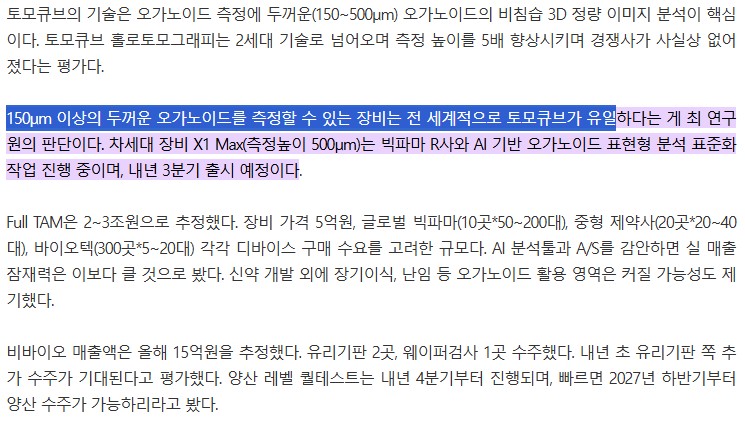 신한투자증권에 따르면 150μm 이상의 두꺼운 오가노이드를 측정할 수 있는 장비는 전세계적으로 토모큐브가 유일하며,
