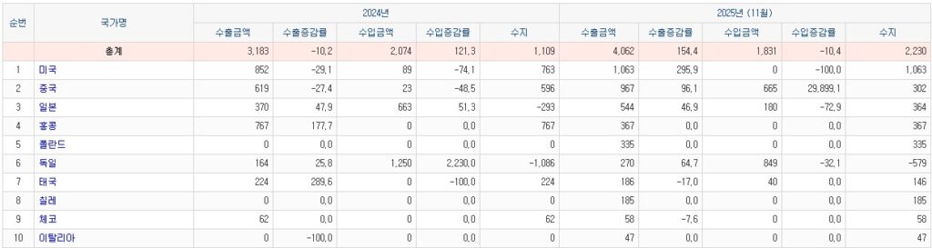 미국 $318K, 체코 $206K정도가 12월 상위 10개국 수출통계로 잡힌다.(합산 $524K)