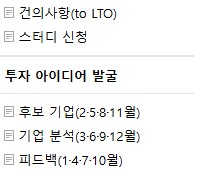 그리고 투자 아이디어 발굴 메뉴 아래 월별로 작성할 게시판을 마련하였다.