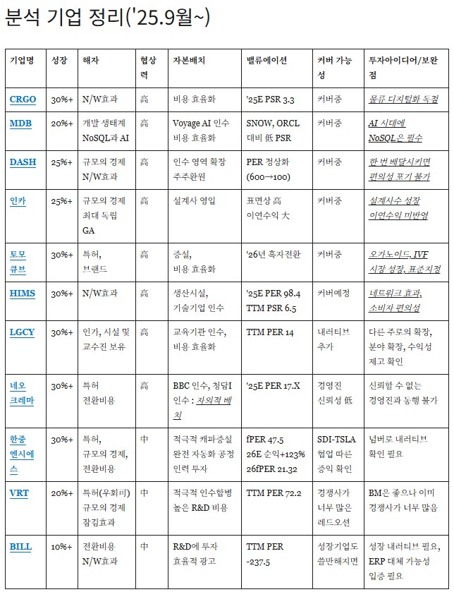 그리고 분기 둘째달에는 발굴한 기업들에 대해 아래 목차에 따라 나머지 5가지 항목에 대해 분석을 해주시면 된다.